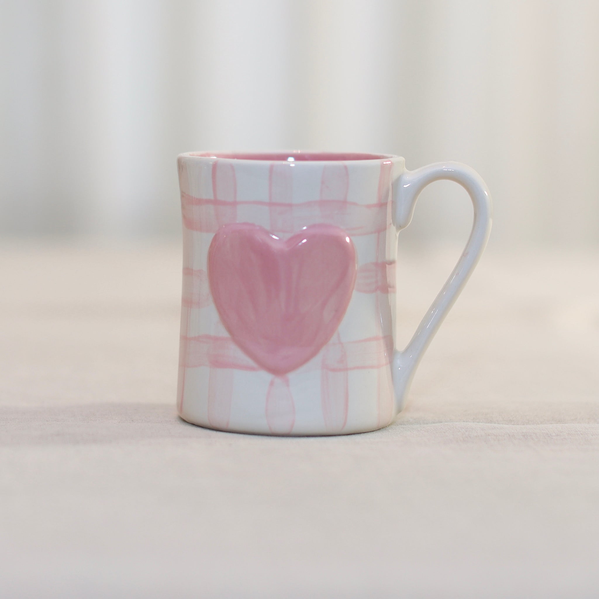 Delight yourself with my hand painted pink heart mug with a gingham pattern.