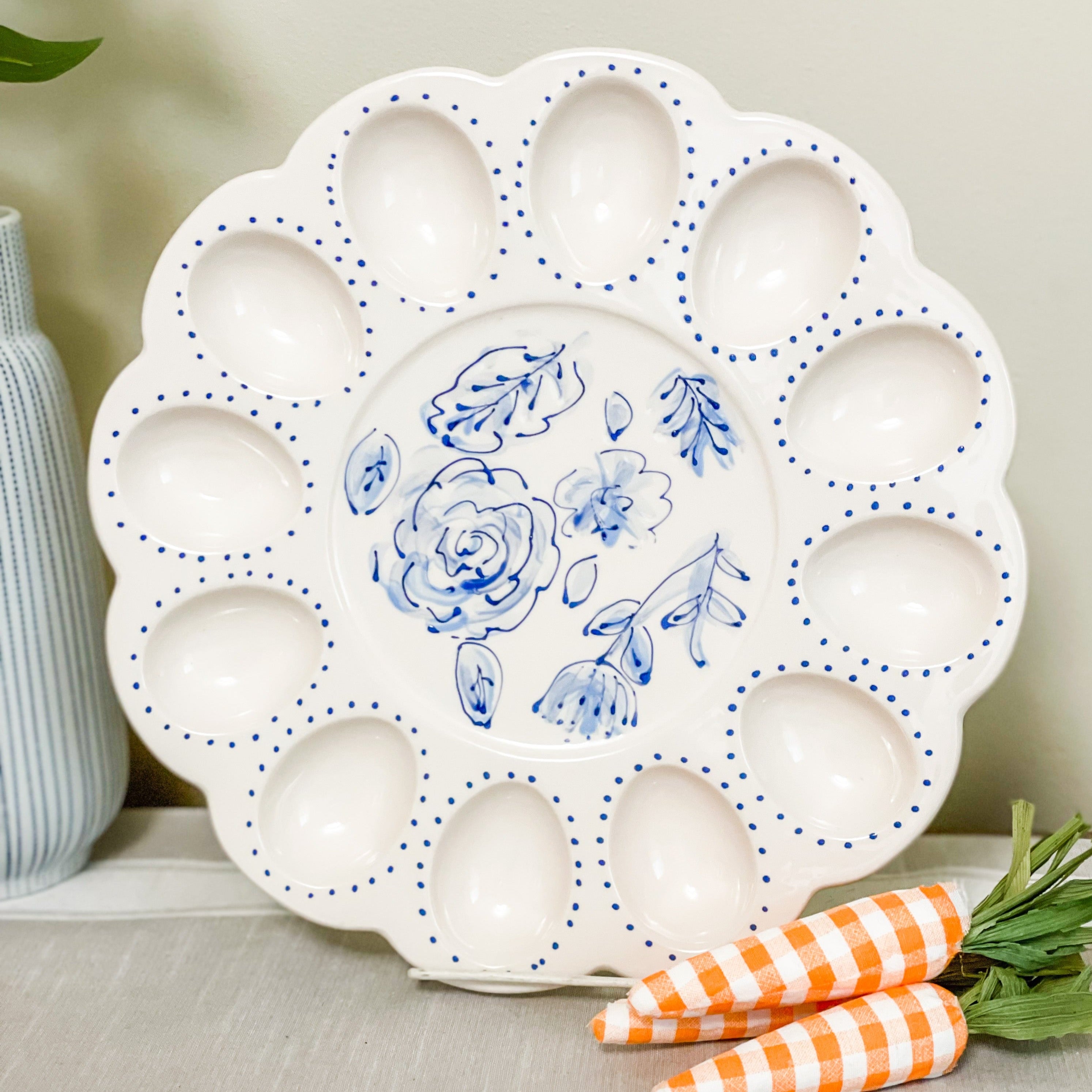 Celebrate spring with this beautiful, hand painted, ceramic deviled egg platter. An instant classic for a beautiful tablescape. A simple, classic design in the center and accented with small dots around each egg tray. This beautiful platter and classic colors make this piece perfect for all year round serving.